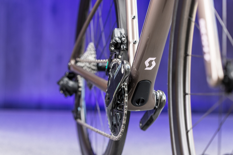 Scott liefert das Addict 10 mit Powermeter aus – perfekt, um auf langen Touren nicht übers Limit zu gehen.Die Sitzgeometrie ist vergleichsweise sportlich und ermöglicht es durch etwas mehr Stack als reinrassige Racer, Spacer unterm Vorbau wegzulassen. Der eher flache Lenkwinkel sorgt ebenso wie die etwas längeren Kettenstreben für einen ausgewogenen, auf sicheren Geradeauslauf fokussierten Charakter.