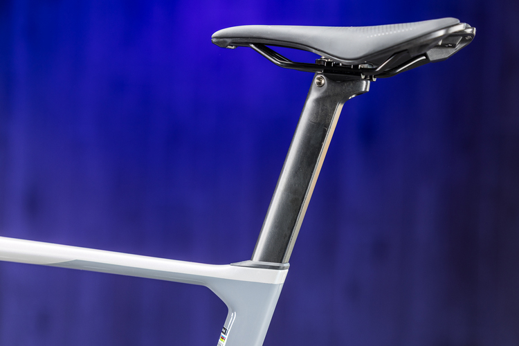 Ein Unterschied zum Profirad ist die „konventionelle“ Sattelstütze statt des nicht sehr praktischen Sitzdoms.Los geht’s mit der Sitzgeometrie, die in Sachen Stack und Reach auf eine gestreckte, flache Haltung abgestimmt ist. Die Abwinkelung der Lenker-Vorbau-Einheit bringt das nun etwas schmalere Cockpit dabei noch etwas weiter nach unten. Der Lenkwinkel ist auf ein neutrales Handling abgestimmt; mit kurzen Kettenstreben und knappem Radstand gewinnt das Aero-Bike jedoch an Handlichkeit und ist damit auf unterschiedliche Rennsituationen zugeschnitten, nicht nur auf hohes Tempo auf geraden Straßen.