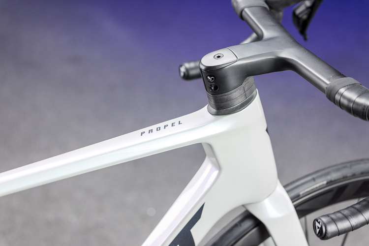 Der leicht nach unten weisende Vorbau verschärft die Sitzposition.Der neue Rahmen wurde subtil optimiert und soll damit noch ein paar Watt mehr sparen; dazu kommt eine moderne UDH-Hinterradaufnahme. Dazu verfügt das Propel nun über 32 mm Reifenfreiheit – für „Road Aero“ ganz schön viel.