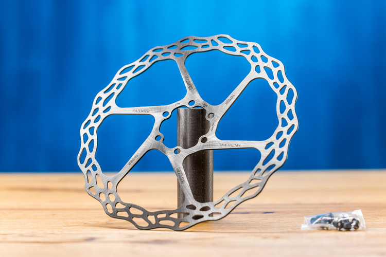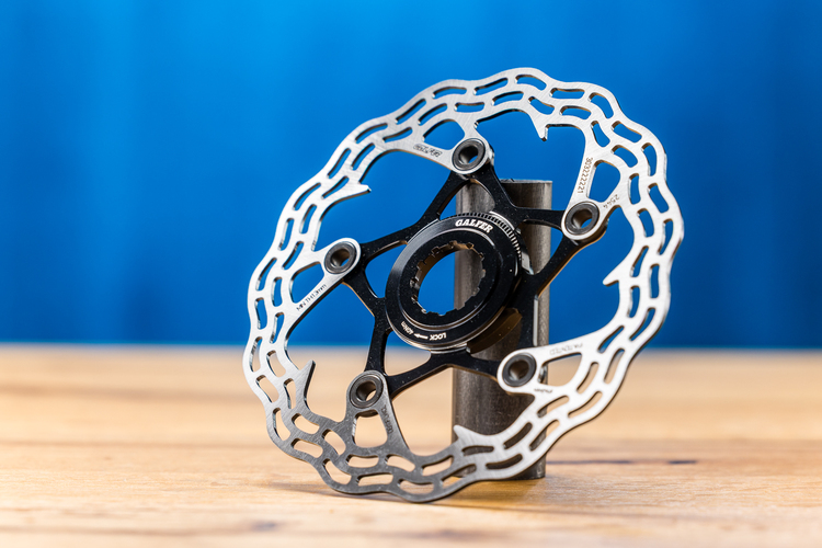 Galfer hat eine Scheibe im Programm, die mit dornförmigen Fortsätzen bessere Wärmeabführung bieten soll.Aufgrund der Steifigkeit der Konstruktion geht Galfer von einer gleichmäßigeren Abnutzung der Beläge aus. Interessant ist auch der Gewichts-Aspekt, denn die 140er Scheibe wiegt inklusive Alu-Lockring nur knapp 100 Gramm, womit sie bis zu 50 Gramm am Laufrad spart.
