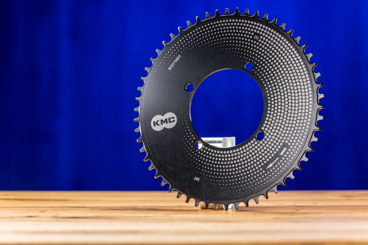 Mit 58 Zähnen ist dies klar ein Kettenblatt fürs Zeitfahren.Vorteil der imposanten 58er Zähnezahl ist, dass die Kette mittig auf der Kassette auf einem größeren Ritzel gefahren werden kann. So ist die Kettenlinie optimal und der weitere Umschlingungswinkel auf der Kassette reduziert die Reibung. Damit ist das KMC-Kettenblatt klar auf den Zeitfahr-Einsatz abgestimmt; für den Fall, dass der Anbieter kleinere Zähnezahlen nachliefert, kann man sich schon jetzt auf den Einsatz am Gravelbike freuen.