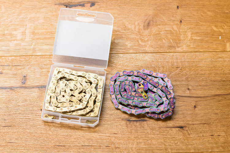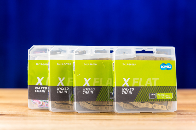 KMC bietet die Flattop-Kette in unterschiedlichen Varianten an.Die mit „KMC Go Wax“ vorbehandelte Kette dürfte im Fahrbetrieb außerdem wartungsärmer sein als eine konventionelle, nachgewachste Kette. Die KMC-Kette muss nämlich nicht entwachst und wieder in flüssiges Wachs eingelegt werden – sie abzuwaschen und mit Go Wax zu beträufeln genügt.