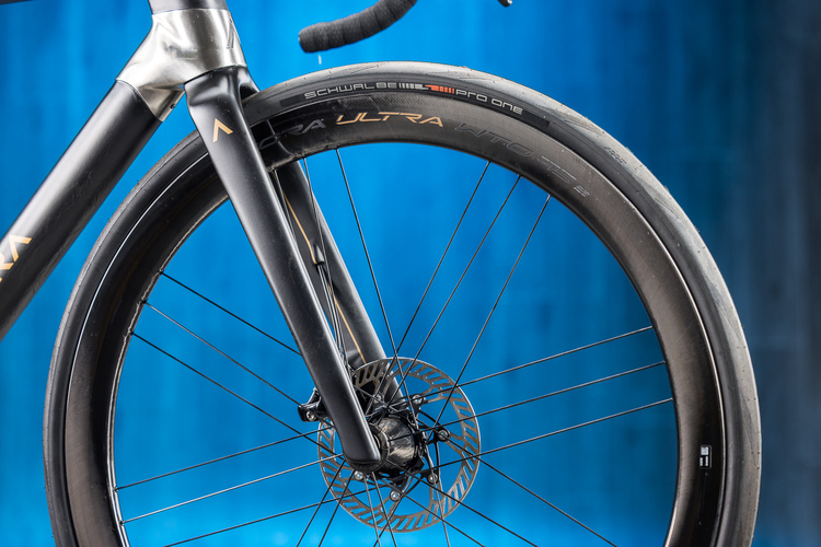 Die nicht ganz so steil angestellte Gabel sorgt für stabilen Geradeauslauf.Im Komplettaufbau mit der neuen Campagnolo Super Record 2x13 und Carbon-Radsatz vom Typ Campagnolo Bura Ultra WTO wirkt das Meisterwerk ausgesprochen stimmig; wie der Rahmen steht auch die Komponentengruppe für die Verbindung von emotionaler Ästhetik und perfekter Funktion.