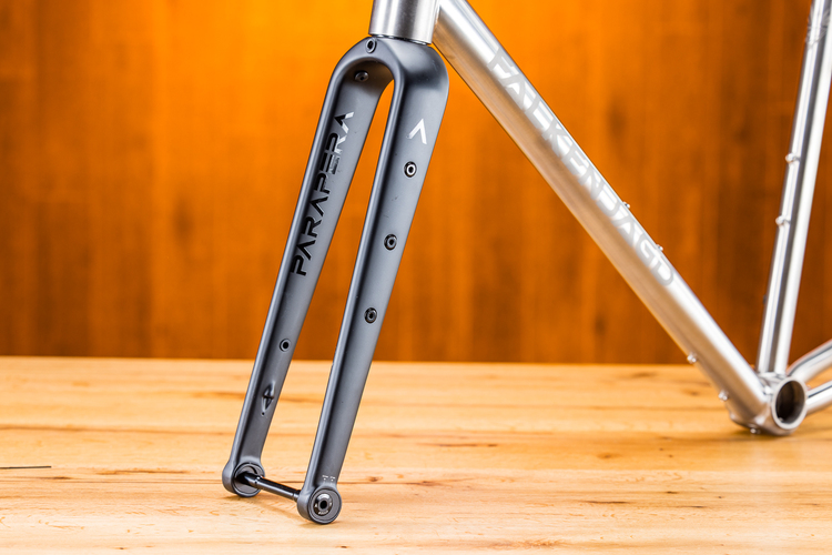 Die Carbongabel zeigt, dass dieses Rad auf den Bikepacking-Einsatz zugeschnitten ist.Überhaupt: Wo das Gepäck am Rahmen scheuert und Staub wie Steinschlag auf die Oberflächen einwirken, ist Titan in seinem Element – nicht zuletzt, weil beim „Grand Tourisme“ das Gewicht weniger im Vordergrund steht als Verlässlichkeit und Stabilität. Dazu wirft das Aristos GT zahlreiche Montagemöglichkeiten in die Waagschale, und auch der mit 45 mm recht groß bemessene Reifendurchlauf spricht Langstreckenfahrer an.