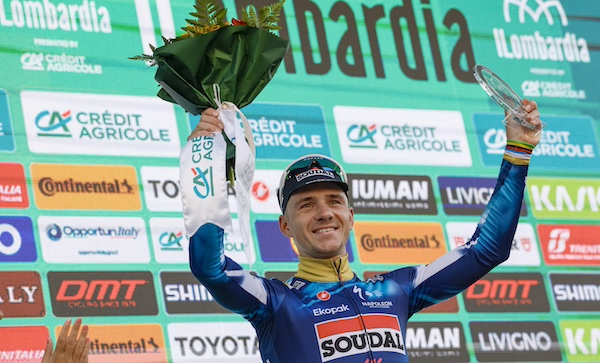 11.10.2025 | (rsn) – Tadej Pogacar (UAE – Emirates – XRG) hat mit einem eindrucksvollen Soloritt über 36 Kilometer die 119. Lombardei-Rundfahrt (1.UWT) gewonnen und damit seinen fünften Sieg in Folge beim "Rennen der fallenden Blätter" gefeiert. Der Slowene distanzierte Remco Evenepoel (Soudal –...