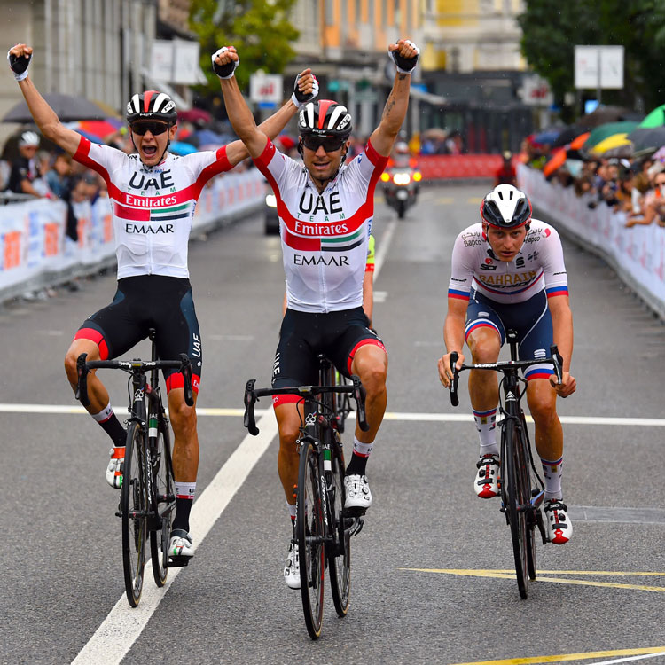 Zwar wurden Ulissi und Nibali auch nach ihrer zweiten gemeinsamen Attacke am Agra-Anstieg wieder gestellt, doch im Zielsprint gelang dann dem UAE-Duo sogar ein Doppelerfolg. “Riabushenko hat mich im Finale fantastisch unterstützt, die Plätze eins und zwei sind ein großartiger Moment für unser Team“, sagte Ulissi, der sich nach den Plätzen drei (2014), zwei (2016) und vier (2018) endlich den ersten Sieg in seiner Wahlheimat holte.
