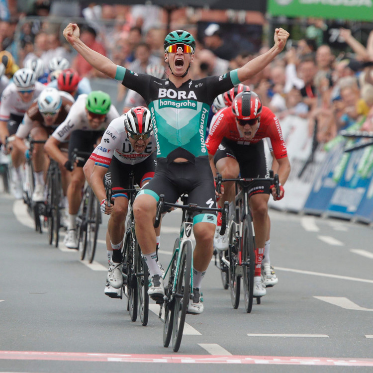 29.08.2019 | (rsn) - In souveräner Manier hat Pascal Ackermann (Bora - hansgrohe) dem Druck zum Auftakt der Deutschland Tour standgehalten und sich in Halberstadt den Etappensieg gesichert. Der 25-Jährige gewann nach 167 Kilometern bei leicht ansteigendem Finale mit knapp drei Radlängen Vorsprung vor dem Norweger Alexander Kristoff (UAE Team Emirates) sowie dessen Anfahrer Simone Consonni. Vierter wurde der Niederlönder Cees Bol (Sunweb) vor Jasper Stuyven (Trek - Segafredo) aus Belgien. Durch den Etappensieg übernahm Ackermann auch das Rote Trikot des Gesamtführenden vor Kristoff und Consonni.