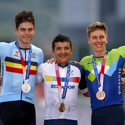 "Das ist ein unglaublicher Moment. All diese Gefühle passen nicht in meinen Körper, das ist wirklich toll", sagte der der 1 Meter 70 große Carapaz, der nach dem Giro-Sieg von 2019 einen weiteren herausragenden Erfolg bejubeln konnte.Mit 1:07 Minuten Rückstand sicherte sich der Belgier Wout Van Aert im Sprint der neunköpfigen Verfolgergruppe die Silbermedaille vor dem slowenischen Tour-de-France-Sieger Tadej Pogacar.