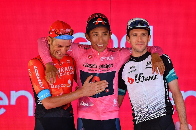 Simon Yates belegte beim Giro hinter Damiano Caruso (v.l./Bahrain Victorious) und Egan Bernal (Ineos Grenadiers) den 3. Platz in der Gesamtwertung. Der Brite ist der letzte starke Rundfahrer im nun auf Sprints und Klassiker umgebauten Team.