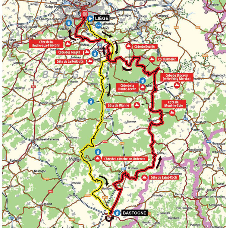 Große Veränderungen im Parcours bleiben dabei aus. Die Männer müssen auf den ersten 120 Kilometern in Richtung Bastogne nur einen klassifizierten Anstieg, die Côte de la Roche-en-Ardenne bewältigen. Flach ist dieser Teil der Strecke dennoch nicht, wie ein Blick auf das Sägezahnprofil des Rennens beweist. Die Frauen starten in Bastogne und fahren von dort aus direkt in Richtung Norden nach Lüttich.