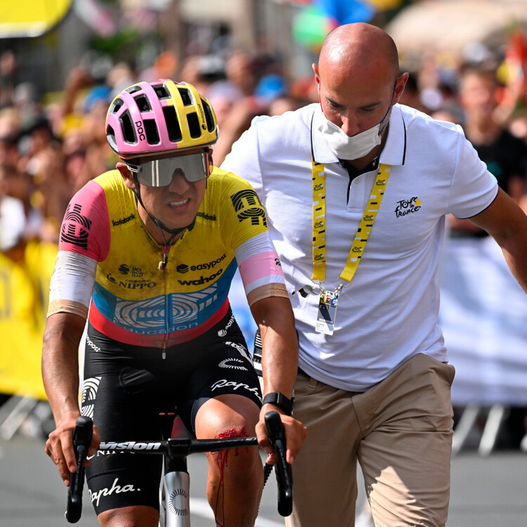 01.07.2023 | (rsn) – Gleich zwei Podiumskandidaten hat die Tour de France auf der 1. Etappe rund um Bilbao bereits verloren: Während Enric Mas (Movistar) das Rennen gleich an Ort und Stelle wegen einer zunächst nicht näher definierten Verletzung am rechten Schulterblatt aufgab, wird am Sonntagmittag auch Olympiasieger Richard Carapaz (EF Education – EasyPost) nicht mehr am Start der 2. Etappe stehen. Wie sein Team am Abend bestätigte, hat sich der Ecuadorianer eine Fraktur an der linken Kniescheibe zugezogen.