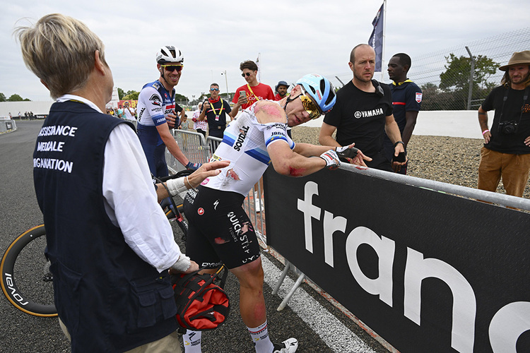 05.07.2023 | Während Jai Hindley (Bora - hansgrohe) einen seiner schönsten Tage als Radprofi überhaupt hatte, erlebte Fabio Jakobsen (Soudal - Quick-Step) auf dieser 5. Etappe der 110. Tour de France einen seiner schwersten. An Armen und Beinen bandagiert trat er diesen Tagesabschnitt von Pau nach Laruns an. Kaum hatte das Peloton allerdings den Startort verlassen und den Kilometer Null passiert, stieg die Straße schon das erste Mal sanft an. “Fabio Jakobsen distancé“ hieß es gleich über Radio Tour.