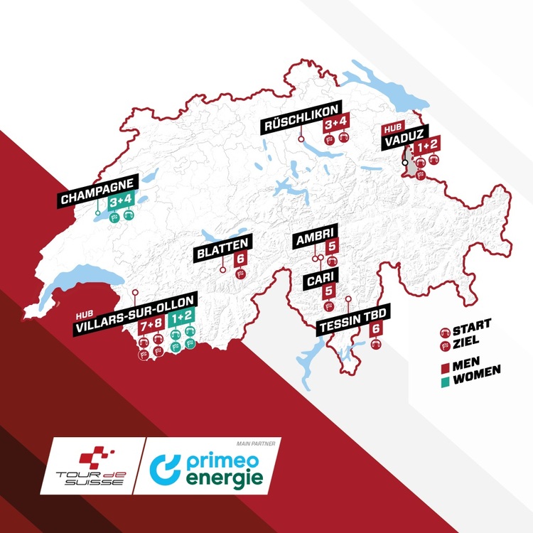 14.12.2023 | (rsn) - Die 87. Tour de Suisse (3. – 16. Juni / 2.UWT) nimmt deutliche Gestalt an. Nachdem die Organisatoren bereits das liechtensteinische Vaduz als Austragungsort der 1. Etappe und Villars-sur-Ollon als den des Schlusstages bekannt gegeben hatten, wurden nun weitere Etappenorte der Schweiz-Rundfahrt 2024 veröffentlicht.