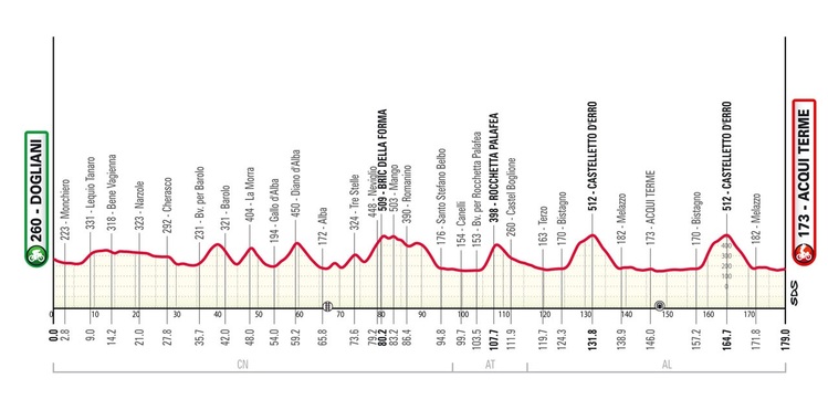 In diesem Jahr führt der Gran Piemonte über 179 Kilometer von Dogliani nach Acqui Terme, das rund 100 Kilometer südöstlich von Turin liegt und für seine schwefelhaltigen Thermalquellen bekannt ist. Die Strecke weist ein hügeliges Profil auf, nach 120 Kilometern geht es auf einen knapp 30 Kilometer langen Rundkurs, der zwei Mal bewältigt werden muss und der einen sechs Kilometer langen und gut fünf Prozent steilen Anstieg aufweist. Vom letzten Bergpreis geht es über 15 Kilometer zunächst bergab und dann flach ins Ziel.