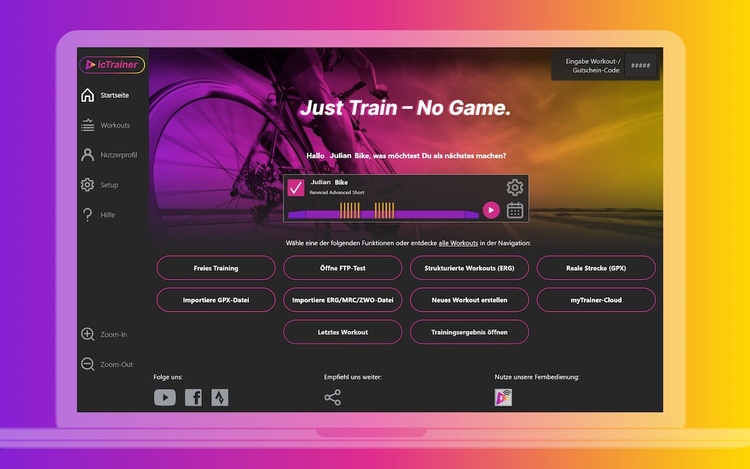Allerdings ist der günstige Preis gar nicht mal das Interessanteste an icTrainer. Eher sind es die guten Möglichkeiten, effizient und abwechslungsreich trainieren zu können, wobei die Software keineswegs auf den Radsport beschränkt ist: Auch mit Laufband, Rudermaschine und ähnlichem kann man icTrainer nutzen. Dabei können unterschiedlichste Sensoren gekoppelt werden, sodass Puls und Leistung, Tretfrequenz und vieles mehr angezeigt werden. Den Nutzerinnen und Nutzern stehen ebenso vorinstallierte Strecken mit realistischer Bildschirmdarstellung zur Verfügung – von der legendären Alpe d’Huez bis zum Pfänder am Bodensee – wie detaillierte Trainingspläne; ebenso kann man Daten hochladen und etwa nach eigenen GPX-Dateien fahren.