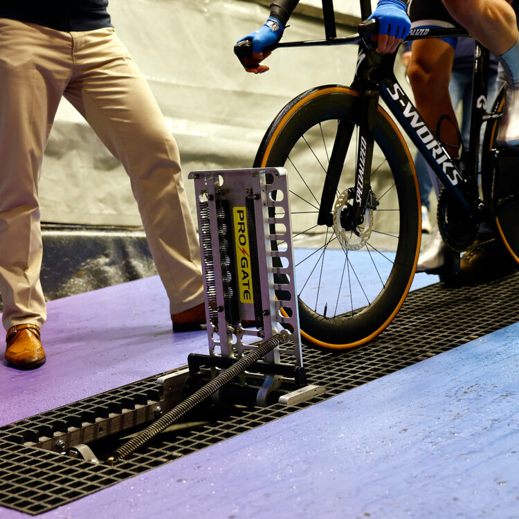 Wenn der UCI-Kommissär die Startzeit heruntergezählt hatte und die Uhr auf 'Null' sprang, senkte sich das Metall und der Prolog begann für den jeweiligen Fahrer. Damit die Radprofis trotzdem aber bereits auf dem Sattel sitzen konnten, stand hinter ihnen wie gewohnt auch ein Kommissär und hielt sie am Sattel fest – wie man es von Starts auf klassischen Startrampen, die oben flach sind und dann erst schräg nach unten führen, kennt.