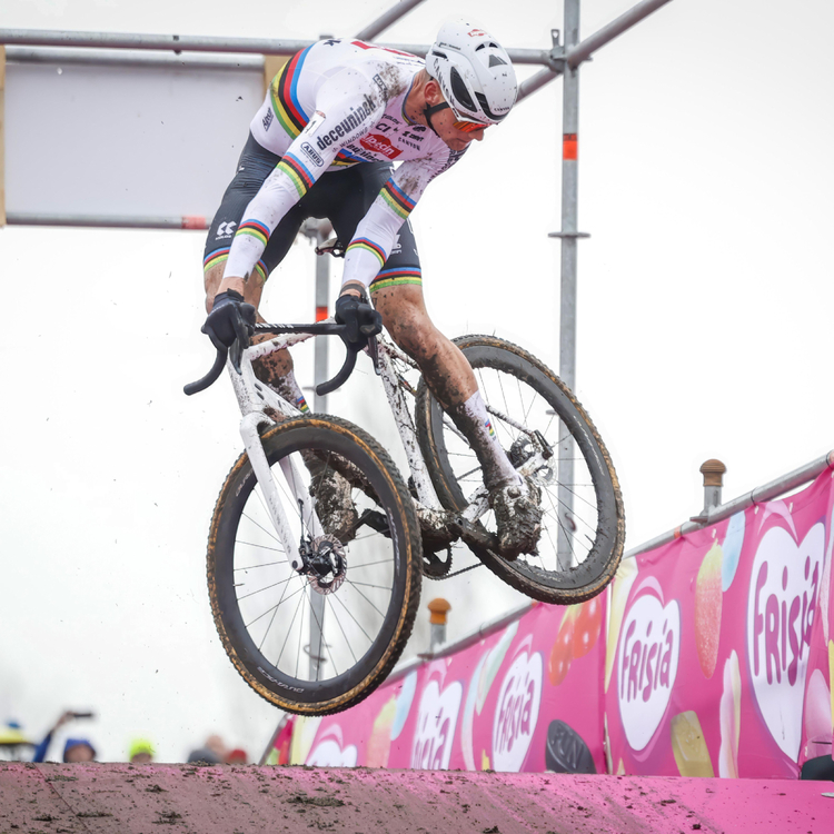 Sieben Cyclocross-Weltmeistertitel später steht er zum Saisonstart 2025 immer noch mit dem Canyon Inflite am Start, das sich die auffällige Silhouette des ersten Modells mit einem Knick im Oberrohr erhalten hat. Dieses Jahr schickt Canyon sein Aushängeschild mit silber glänzender Lackierung und standesgemäßen Weltmeisterstreifen ins Rennen.