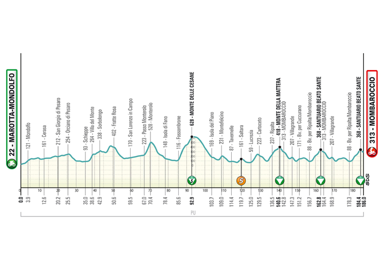 Am sieben Kilometer langen und sieben Prozent steilen Monte delle Cesane, der zur Etappenmitte anstand, holte sich Bou die maximal 15 möglichen Punkte und rückte auf Rang zwei der Bergwertung vor. Red Bull kontrollierte das Geschehen im Feld, das es nicht eilig hatte, die Ausreißer wieder einzufangen. Kurz vor dem Monte della Mattera, dem zweiten Anstieg des Tages hatten die von ihrem Vorsprung nur gut eine Minute eingebüßt.