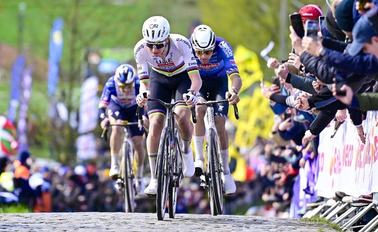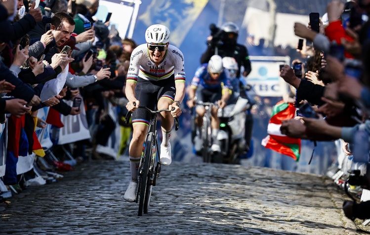 Bei der letzten Überfahrt des Oude Kwaremont konnte er Pogacar dennoch nicht halten. Die Lücke war oben jedoch deutlich kleiner als letztes Jahr, van der Poel schien auch früher in eine Art Zeitfahrmodus überzugehen, um sich nicht komplett in den roten Bereich zu bringen. Pogacar absolvierte den Anstieg sechs Sekunden schneller, konnte auf den nächsten Kilometern und am Paterberg aber schnell eine Lücke von 20 später 40 Sekunden reißen.