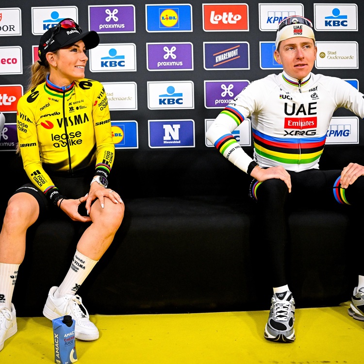 06.04.2026 | (rsn) – Tadej Pogacar (UEA – Team – Emirates – XRG) hat auf dem Weg zur Siegerehrung der Flandern-Rundfahrt in Oudenaarde der Französin Pauline Ferrand-Prévot (Visma – Lease a Bike) großzügig eine Mitfahrgelegenheit angeboten – und zwar auf dem Oberrohr seines Fahrrads.
