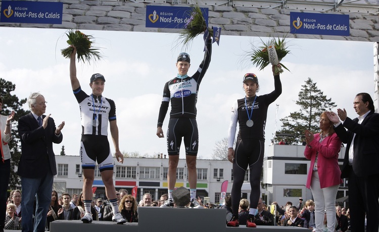 So schrumpft der Abstand, auch wenn Degenkolb das Trio jetzt zieht. Drei Kilometer vor dem Ziel springt Stybar zur Gruppe, unter dem Teufelslappen auf dem letzten Sektor, Espace Charles Crupelandt, kommen auch Boom, Keukeleire und Elmiger zurück. Es soll ihnen aber nichts mehr bringen. In der letzten langgezogenen Kurve, 200 Meter vor dem Ziel, setzt Degenkolb zum Sprint an. Weder Stybar noch Van Avermaet können kontern, müssen sich mit den Plätzen zufriedengeben. Mit mehr als einer Radlänge Vorsprung gewinnt John Degenkolb Paris-Roubaix 2015.