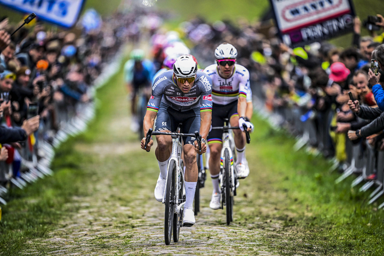 Auf dem schwierigsten Sektor des Rennens, der Trouée d’Arenberg, konterte er eine Attacke Pogacars und konnte eine kleine Lücke reißen. Direkt nach dem Kopfsteinpflaster hielt der Niederländer das Tempo hoch und zwang Pogacar auf flacher Strecke im Wind, wieder zu ihm aufzuschließen.