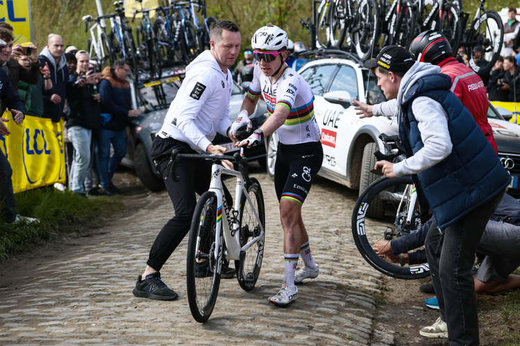 Tadej Pogacar musste 2025 nach seinem entscheidenden Fehler das Rad wechseln | Foto: Cor Vos