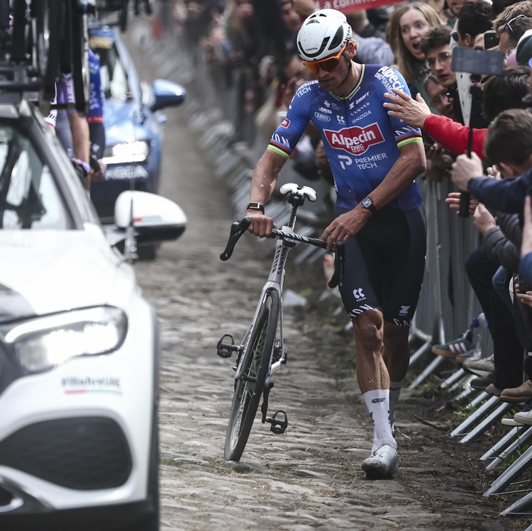 Nach einigen Metern stieg van der Poel aber wieder ab, lief am Wegrand zurück zu seinem Rad, an dem sich mittlerweile ein weiterer Teamkollege zu schaffen machte: Tibor del Grosso baute seinem Kapitän ein neues Vorderrad ein, doch das hatte dann auch gleich wieder einen Platten, so dass der dreimalige Roubaix-Sieger wieder vom Rad musste. In der Zwischenzeit war der Abstand zur Spitze um Pogacar und Wout van Aert (Visma – Lease a Bike auf zwei Minuten angewachsen. Trotzdem versuchte van der Poel wieder, den Anschluss an die Spitze zu schaffen...
