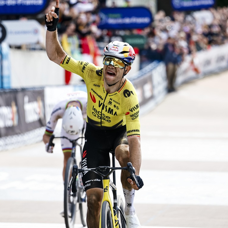 Der Triumphator, der wie alle anderen Favoriten mit Defektpech zu kämpfen hatte, widmete den für ihn besonders emotionalen Sieg seinem früheren Teamkollegen Mike Goolaerts, der 2018 nach einem Sturz bei Paris-Roubaix verstorben war. “Es bedeutet mir alles! Es war ein Ziel von mir seit 2018, als ich das Rennen das erste Mal gefahren bin. Das war vor acht Jahren, und ich habe damals meinen Teamkollegen Mike Goolaerts verloren. Seit dem wollte ich hierherkommen und meinen Finger für ihn zum Himmel strecken“, sagte der sichtlich bewegte Van Aert, der mit eben jener Geste über den Zielstrich gefahren war.