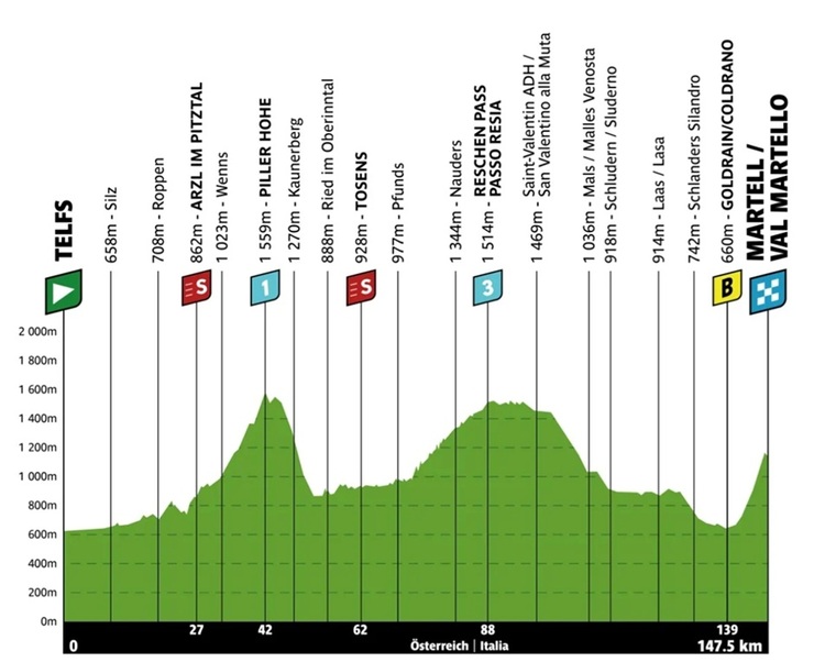 Bais sicherte sich an der Piller Höhe (1. Kat.) den ersten der beiden Bergpreise vor Zangerle, der damit seine Führung in dieser Sonderwertung festigte. Nach der Abfahrt und einer kürzeren Flachpassage folgte der 16 Kilometer lange, aber mit 3,3 Prozent nur moderat steile Anstieg zum Reschenpass (3. Kat.), wo aufgrund der Tempoarbeit der Favoritenteams der Vorsprung der Spitzenreiter auf unter drei Minuten schrumpfte. Als Zweiter auch an der letzten Bergwertung des Tages baute Zangerle seine Führung im Kampf um das blaue Bergtrikot weiter aus.