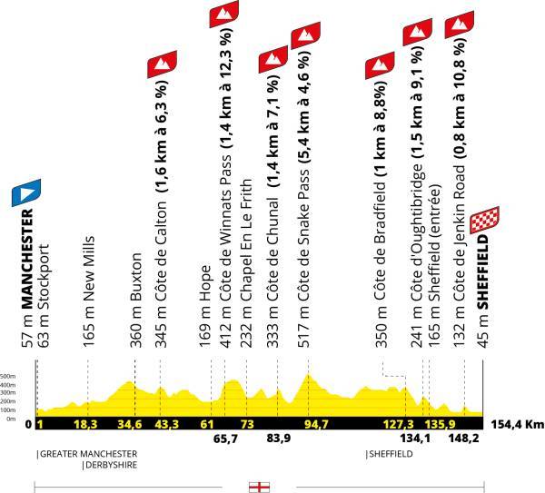 Tagsdrauf beginnt die 2. Etappe im Zielort des Vortages, Manchester. Sie ist fast doppelt so lang und beinhaltet auf 154,4 Kilometern ganze sieben kategorisierte Anstiege vor dem Ziel in Sheffield. Insgesamt kommen an diesem Tag knapp 3.000 Höhenmeter zusammen. Allein innerhalb der letzten 20 Kilometer geht es in Bradfield einen Kilometer bei 8,8 Prozent bergauf, in Oughtibridge 1,5 Kiometer bei 9,1 Prozent und schließlich sechs Kilometer vor dem Zielstrich auch noch in der Jenkin Road 800 Meter bei 10,8 Prozent.