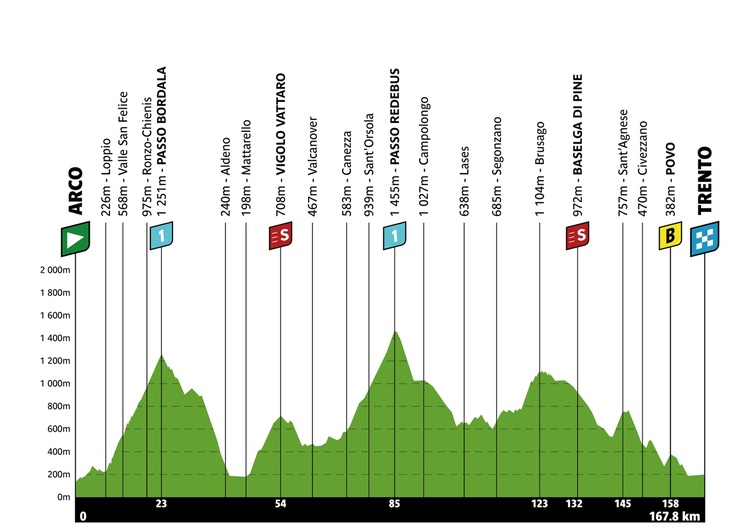 Jasch behauptete seinen Vorsprung auf Rodriguez und Juul-Jensen, die ihre Begleiter abgeschüttelt hatten und holte sich am Ende der letzten kurzen Steigung des Tages in Povo den Bonussprint – auf den hatte es der Solist an der Spitze aber nicht abgesehen. Spannender wurde es dahinter, nachdem Pellizzari attackiert hatte, ehe sich sein Teamkollege Vlasov am Sprint vier Sekunden vor Bernal holte. Damit reduzierte der Kolumbianer seinen Rückstand zum Grünen Trikot um weitere zwei Sekunden.