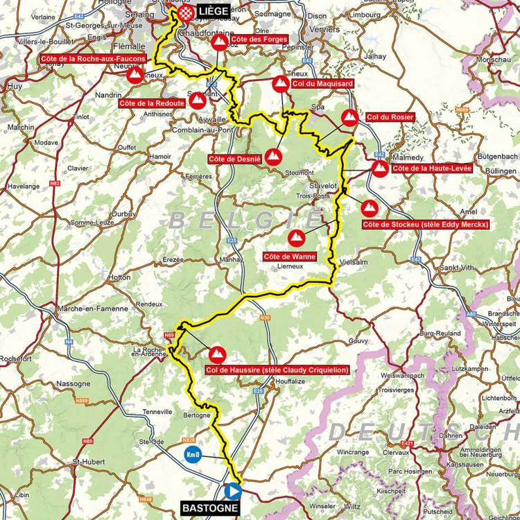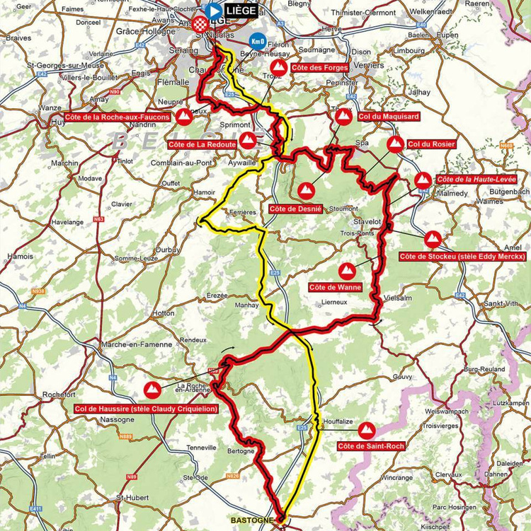 Für die Männer beginnt La Doyenne bereits um 9:55 Uhr in Lüttich am Quai des Ardennes, wo 259,5 Rennkilometer später auch der Zielstrich wartet. Vom Start aus bewegt sich das Peloton südöstlich aus der Großstadt hinaus und dann in südlicher Richtung meist parallel zur Autobahn E25 nach Bastogne.