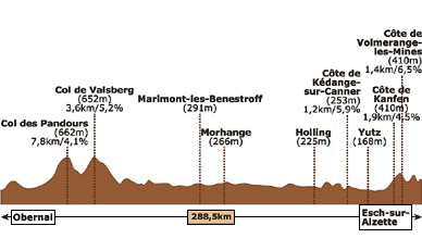 Im Vergleich zum Vortag wird die Etappe von Obernai nach Esch-sur-Alzette deutlich anspruchsvoller. Gleich zu Beginn des 228,5 Kilometer langen Teilabschnitts warten auf die Fahrer zwei Anstiege der 3. Kategorie. Gut möglich, dass Ausreißer zur Attacke blasen und ihr Heil in der Flucht suchen. Nach über 120 flachen Kilometern wird es in der Endphase wieder anspruchsvoller. Auf den letzten 40 Kilometern warten noch einmal drei Steigungen der 4. Kategorie auf das Peloton. Man darf gespannt sein, ob es in der Endphase der Etappe schon zu einer Überraschungsattacke eines Klassementfahrers kommt. Für die Sprinter wird es heute jedenfalls sehr schwer. Stattdessen könnten Klassikerjäger wie Danilo Di Luca (Liquigas) zum Zuge kommen und im luxemburgischen Esch-Sur-Alzette einen Etappensieg feiern. Vielleicht bekommt aber auch der luxemburgische Lokalmatador Fränk Schleck (CSC) von seinem Kapitän Ivan Basso freie Fahrt, um auf den letzten 10 Kilometern, die durch Luxemburg führen, eine Attacke zu setzen.