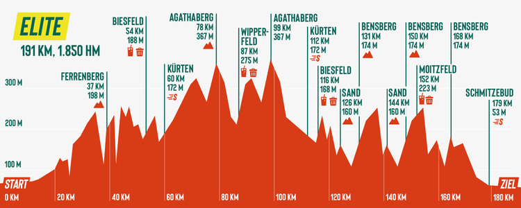In diesem Jahr führt Rund um Köln über 191 Kilometer, wobei nach offiziellen Angaben 20 Anstiege mit insgesamt 1.850 Höhenmetern – in etwa genauso viele wie 2025 - bewältigt werden müssen. Auf der Fahrt durch das Bergische Land stehen dabei neben den beiden Runden über den Agathaberg gleich drei Schleifen – statt bisher einer - über Sand und zum Schloss Bensberg an, ehe es über die Abfahrt zum Ziel am Kölner Rheinauhafen geht