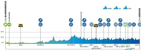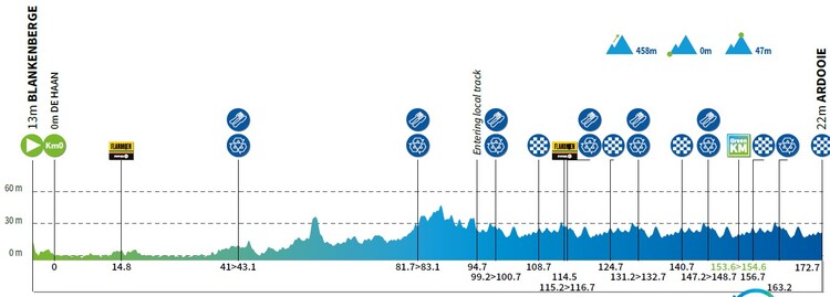 Etwas hügeliger als der Auftakt, aber eben nur einen Tick, wird das zweite Teilstück. Von Blankenberge an der belgischen Küste nordwestlich von Brügge geht es ins Herzen Westflanderns nach Ardooie – etwas außerhalb von Roeselare gelegen. Die sogenannten flämischen Ardennen, also die von den Klassikern berühmten Hellingen, erreicht man dabei allerdings nicht und so kommen auch hier nur 458 Höhenmeter zusammen. Rund um Ardooie wird ein 16 Kilometer langer Rundkurs am Ende vier Mal zu absolvieren sein, der aber mit einem perfekt für den erwarteten Massensprint geeigneten Schlusskilometer endet. 2024 gewann dort Jonathan Milan, 2023 Jasper Philipsen.