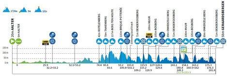 Mit Tag drei erreicht die Renewi Tour die Hügel Flanderns. Von Aalter aus geht es auf den ersten 70 Kilometern noch flach dahin, dann aber folgt eine ganze Reihe der berühmt-berüchtigten Hellingen: Rotelenberg, Taaienberg, Berg Ten Houte und Brique-Potterée führen in Richtung Geraardsbergen, das über den Denderoodberg erreicht wird. Nach 115 Kilometern geht es erstmals über den Zielstrich am Fuß der “Muur“, die es dann anschließend auch hinaufgeht. Es folgt, wie beim Omloop, der Bosberg und dann geht es direkt weiter über den Onkerzeleberg und wellig zurück nach Geraardsbergen und wieder über den Denderoodberg zur zweiten Zielpassage. Diese knapp 38 Kilometer lange Runde muss dann noch ein zweites Mal gefahren werden, bevor es am Fuß der Muur um den Tagessieg geht, wo es nach 181,9 Kilometern und 1.724 Höhenmetern sicherlich keinen Massensprint mehr geben wird.