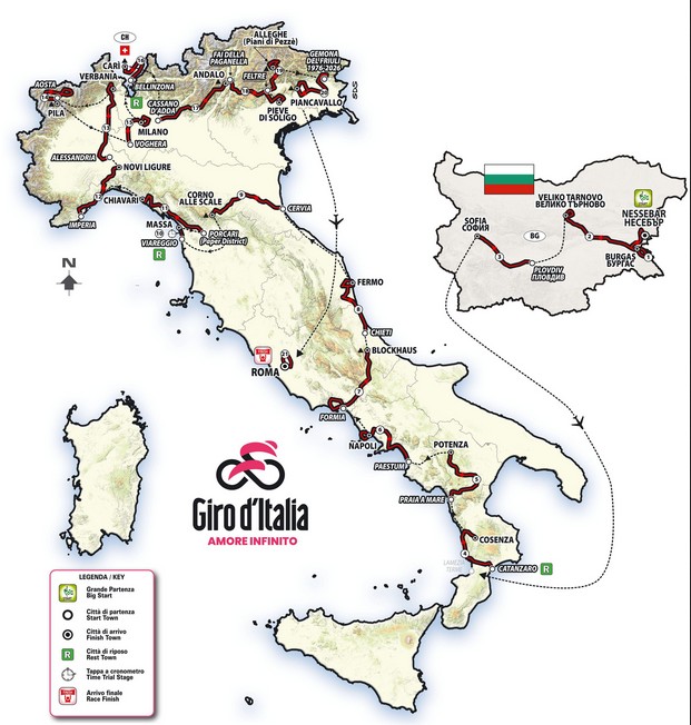 Der 109. Giro d`Italia (2.UWT) wird im Mai 2026 über 21 Etappen und 3.459 Kilometer mit 49.150 Höhenmetern führen. Vom Grande Partenza in Bulgarien führen die ersten drei Teilstücke durch das Land am Schwarzen Meer, bevor dann ein früher erster Ruhetag für den Flug nach Italien genutzt wird. Enden wird die Italien-Rundfahrt erneut in Rom. Aber auch Mailand, das nach den Regeln des Abwechselns eigentlich für die Schlussetappe an der Reihe gewesen wäre, wird als Etappenziel am Ende der zweiten Giro-Woche besucht. [weiter]