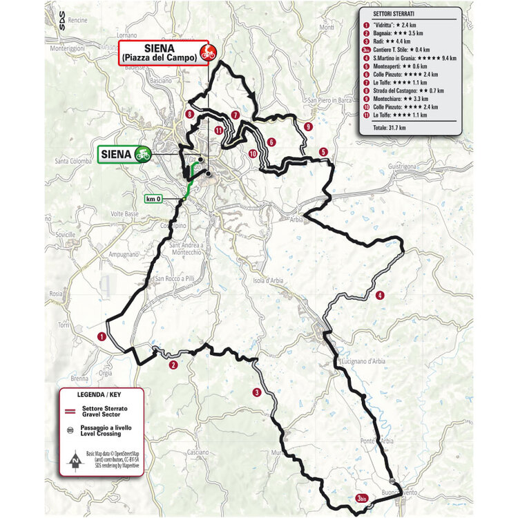 Die 12. Ausgabe der Strade Bianche Donne wartet mit zwei Schotterabschnitten weniger auf. Waren es 2025 noch insgesamt 13, so müssen die Fahrerinnen bei der 12. Ausgabe wie bei den Männern nur noch elf bewältigen. Zwischen Start und Ziel in Siena liegen 131 Kilometer, wovon 32,6 über Schotterstraßen führen. Von Le Tolfe, dem letzten Sektor, geht es über knapp zwölf Kilometer bis auf die Piazza del Campo. [weiter]