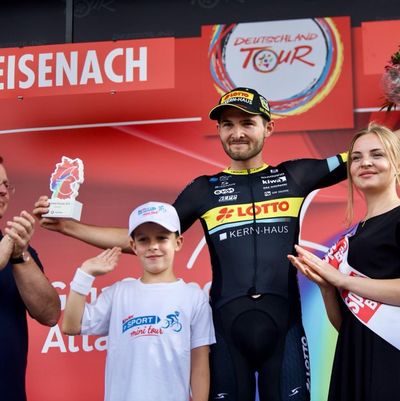 02.09.2019 | (rsn) - Auf eine gute Deutschland Tour blickt das Team Team Lotto- Kern Haus zurück. Das Highlight für die Mannschaft aus der dritten Radsportliga war sicher die Auszeichnung von Joshua Huppertz als kämpferischster Fahrer auf der letzten Etappe von Eisenach nach Erfurt.